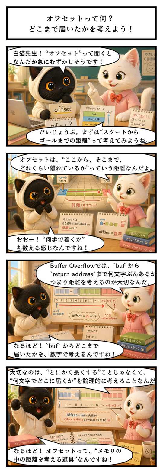 つまりオフセットを学ぶことは、単に距離を覚えることではなく、メモリ破壊を論理的に言語化する練習でもあります。