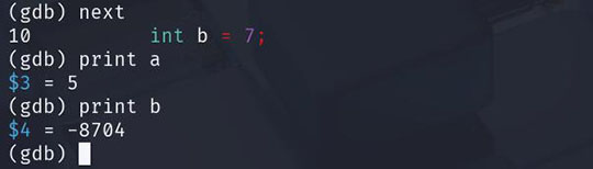 自分で作った小さなプログラムを、"-g"付きでコンパイルし、"break"で止めてから"list"で現在地を確認し、"next/step"で少しずつ進めながら、"print"で値を見ます。