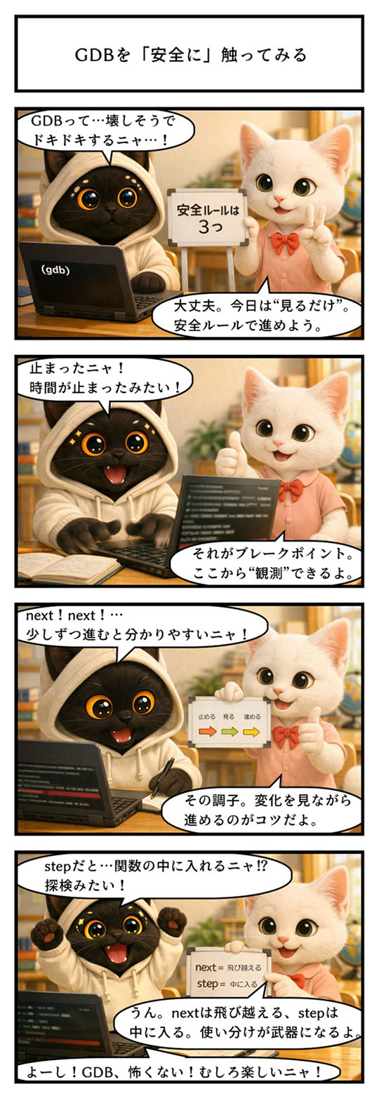 この差を体感すると、どこで何が起きているかを自分の目で確かめられるようになります。つまりGDBは怖い道具ではなく、止める→見る→進めるのサイクルで理解を積み上げる「安全な顕微鏡」なのです。