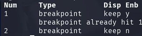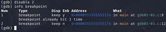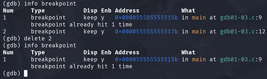 また、"info breakpoints" で一覧を見て、"disable/enable" で一時的に止めない設定にし、不要なら "delete" で消すと管理が楽になります。