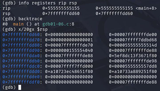 まずブレークポイントで時間を止め、RIPで現在地、backtraceで履歴、RSP周辺のメモリで現場を確認し、事実を集めます。次に仮説は1つだけ立て、"next/step"や"ni/si"で少し進めて同じ観測を繰り返し、差分から仮説を判定します。