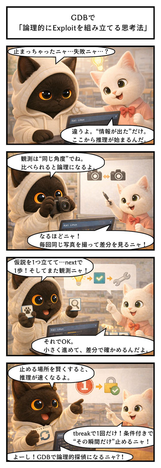 GDBで論理的に解析(Exploit理解)する鍵は、コマンド暗記ではなく「観測→仮説→検証→修正」の思考ループを回すことです。