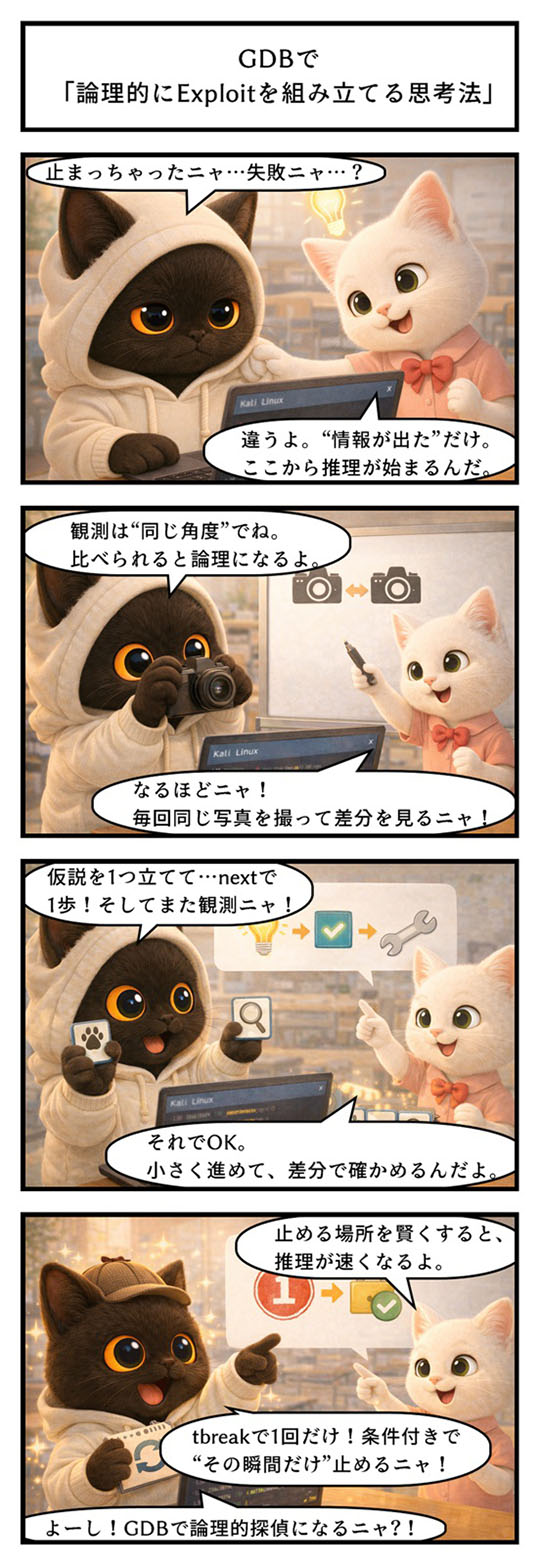 GDBで論理的に解析(Exploit理解)する鍵は、コマンド暗記ではなく「観測→仮説→検証→修正」の思考ループを回すことです。