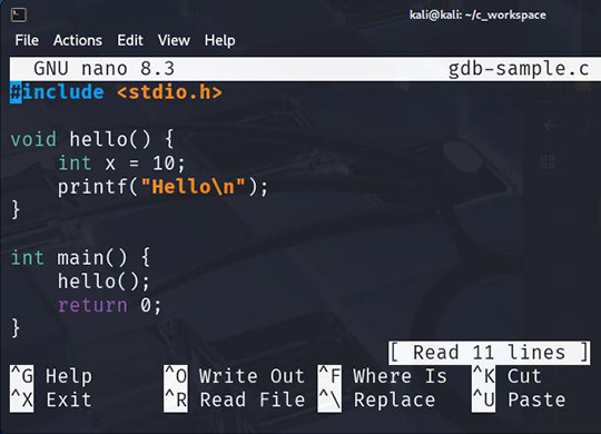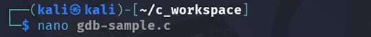 a.ファイル名:gdb-sample.c で、nanoエディターを立ち上げます。