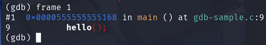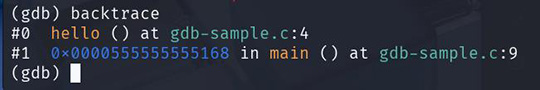 #1 0x0000555555555168 in main () at gdb-sample.c:9