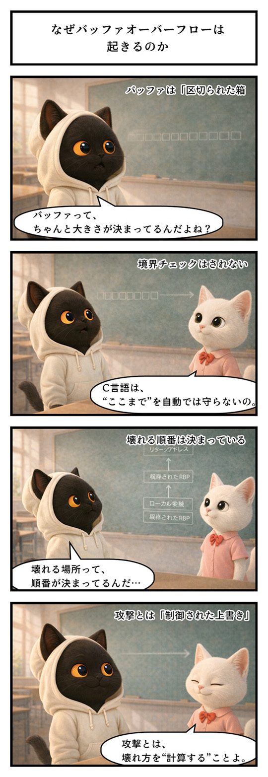 しかし実際には、バッファオーバーフローは、CPU・メモリ・スタックの基本構造を理解していないと必ず起きる「自然な事故」とも言えます。