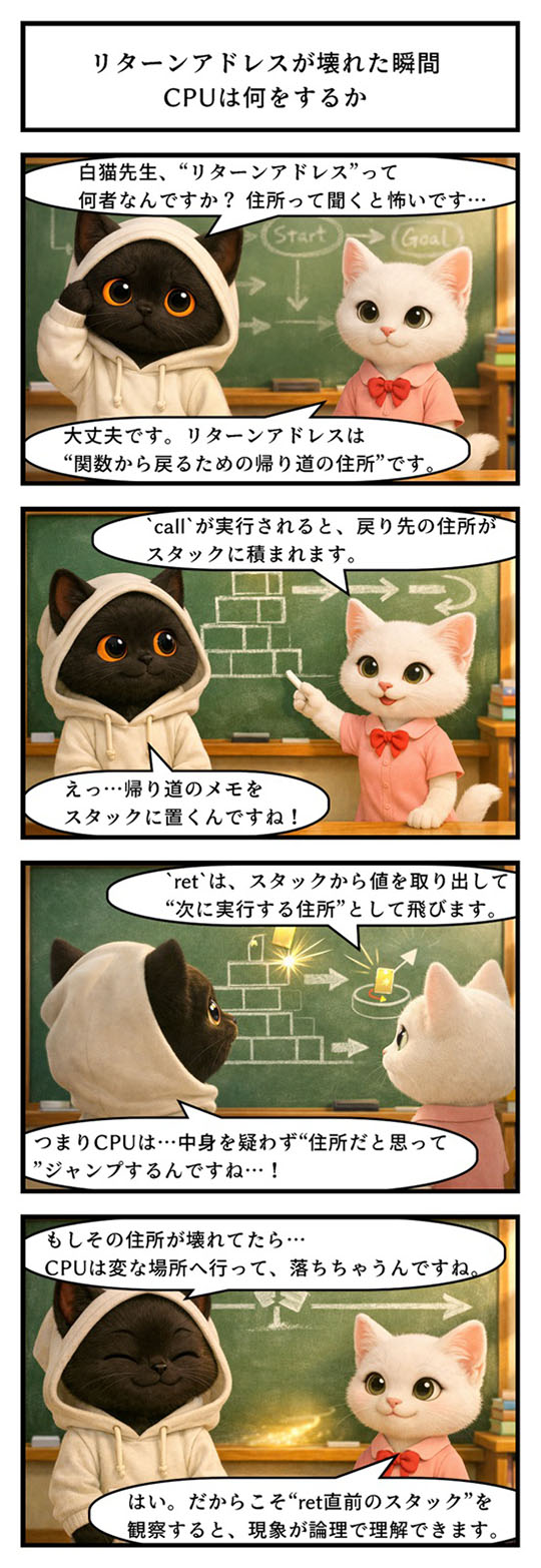 つまり、"ret"は「スタック上の値=戻り先住所」として 機械的にジャンプ します。CPUは、その値が正しいか、危険か、意図的に壊されたかを判断しません。CPUはただ「住所だと思って飛ぶ」だけです。