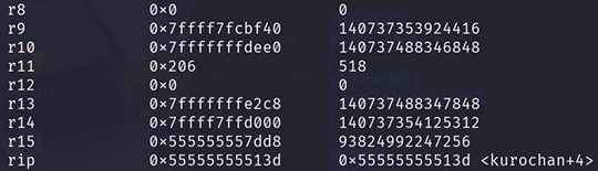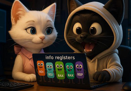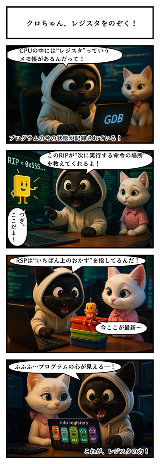 ハッカーや開発者はGDBを使ってこれらのレジスタをのぞくことで、プログラムの動きや弱点を理解します。代表的なレジスタには、次に実行する命令の位置を指すRIP、スタックの先頭を示すRSP、関数の基準位置を記録するRBPがあります。